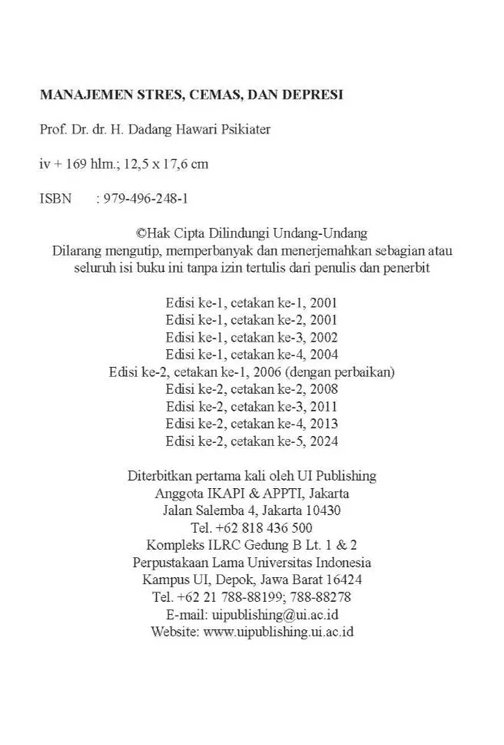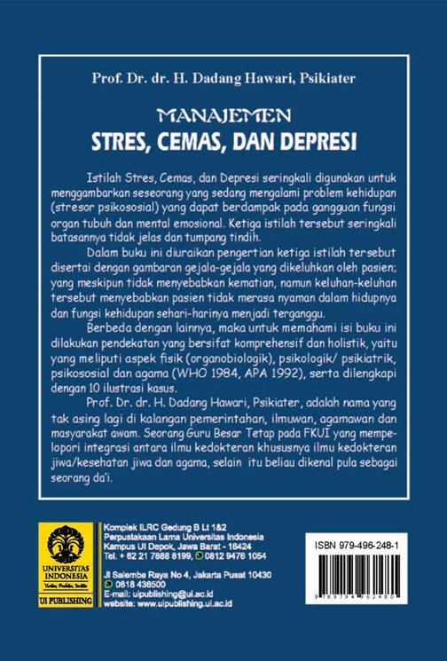 Istilah Stres, Cemas, dan Depresi seringkali digunakan untuk menggambarkan seseorang yang sedang mengalami problem kehidupan (stresor psikososial) yang dapat berdampak pada gangguan fungsi organ tubuh dan mental emosional. Ketiga istilah tersebut seringkali batasannya tidak jelas dan tumpang tindih. Dalam buku ini diuraikan pengertian ketiga istilah tersebut disertai dengan gambaran gejala-gejala yang dikeluhkan.