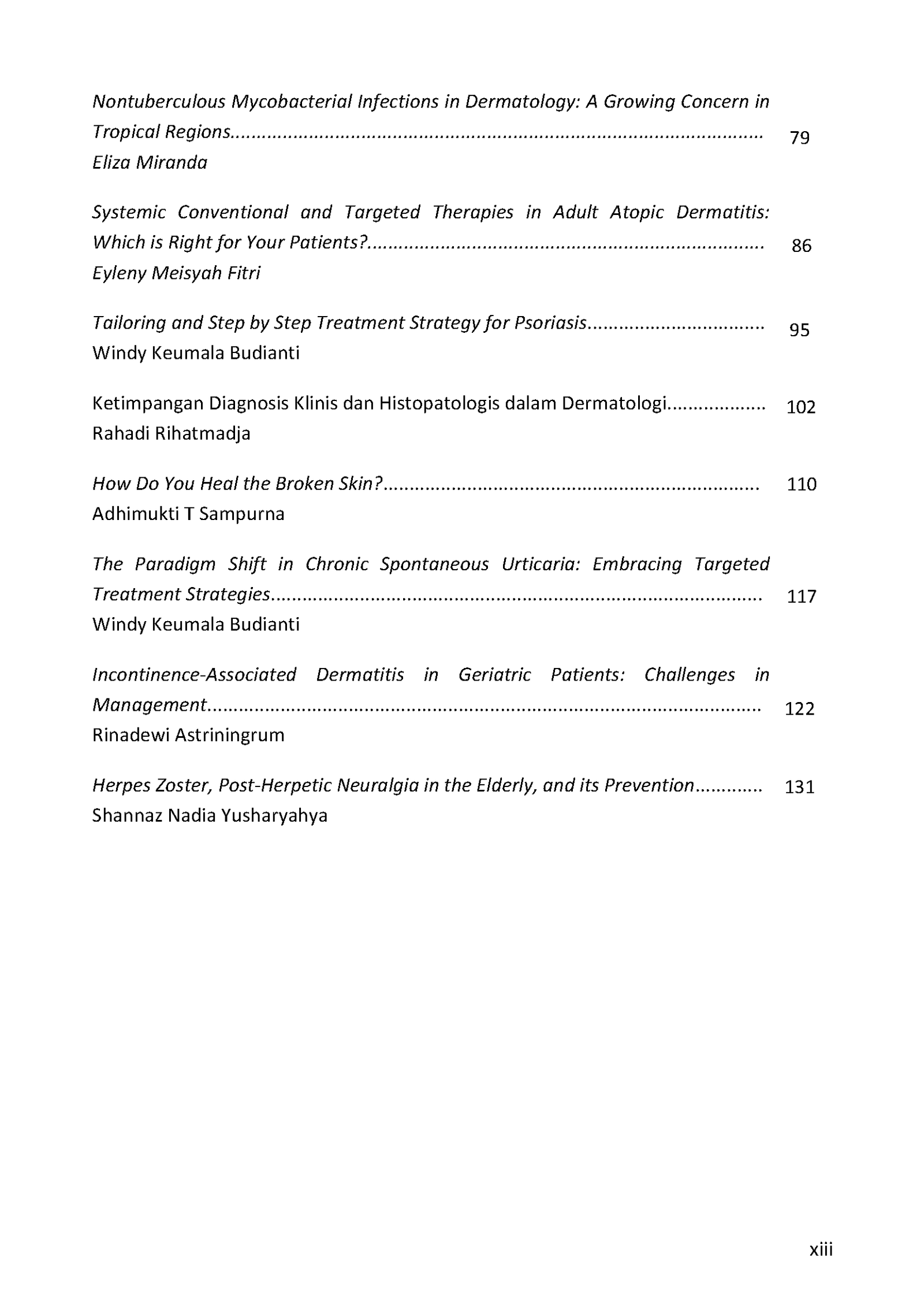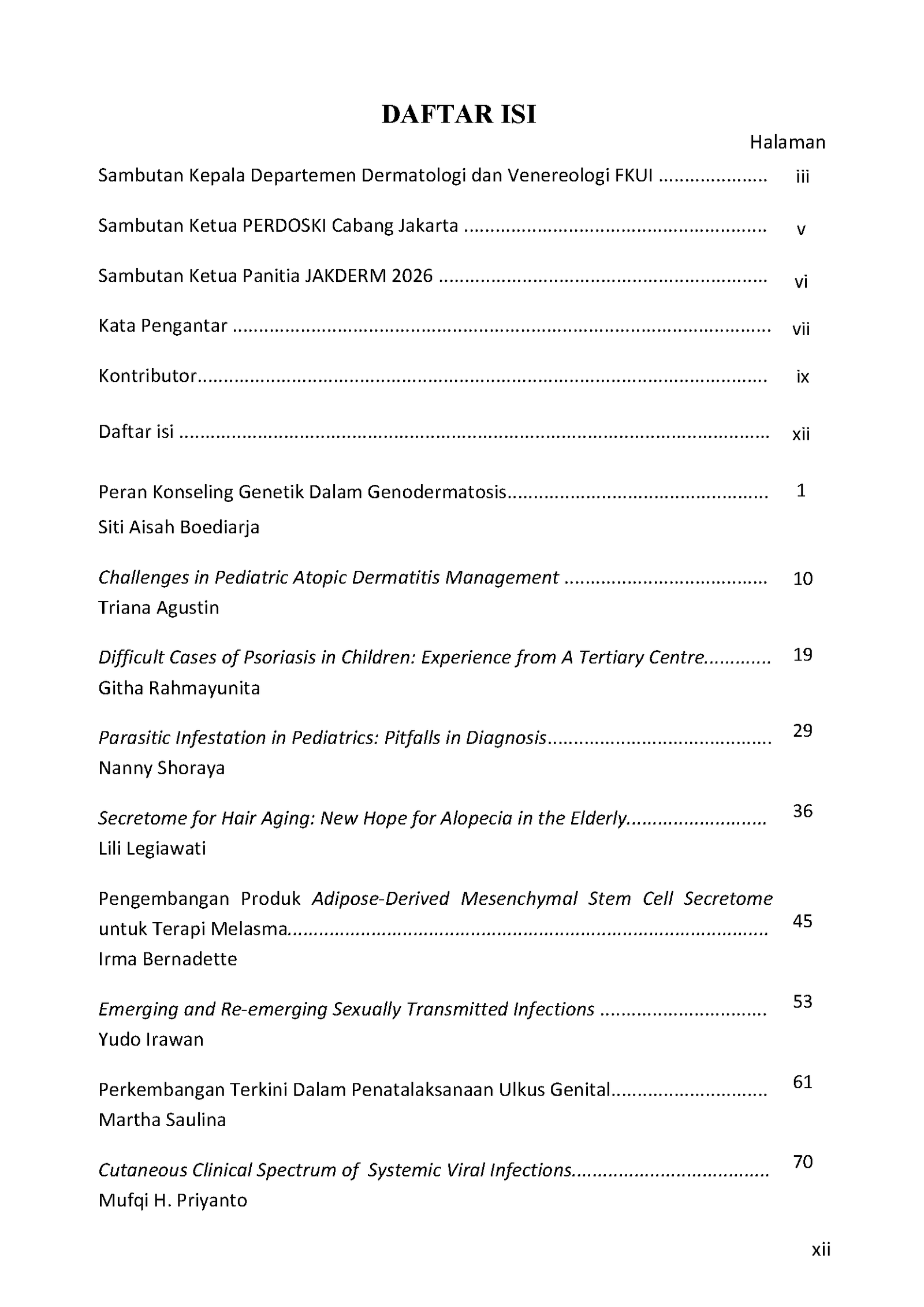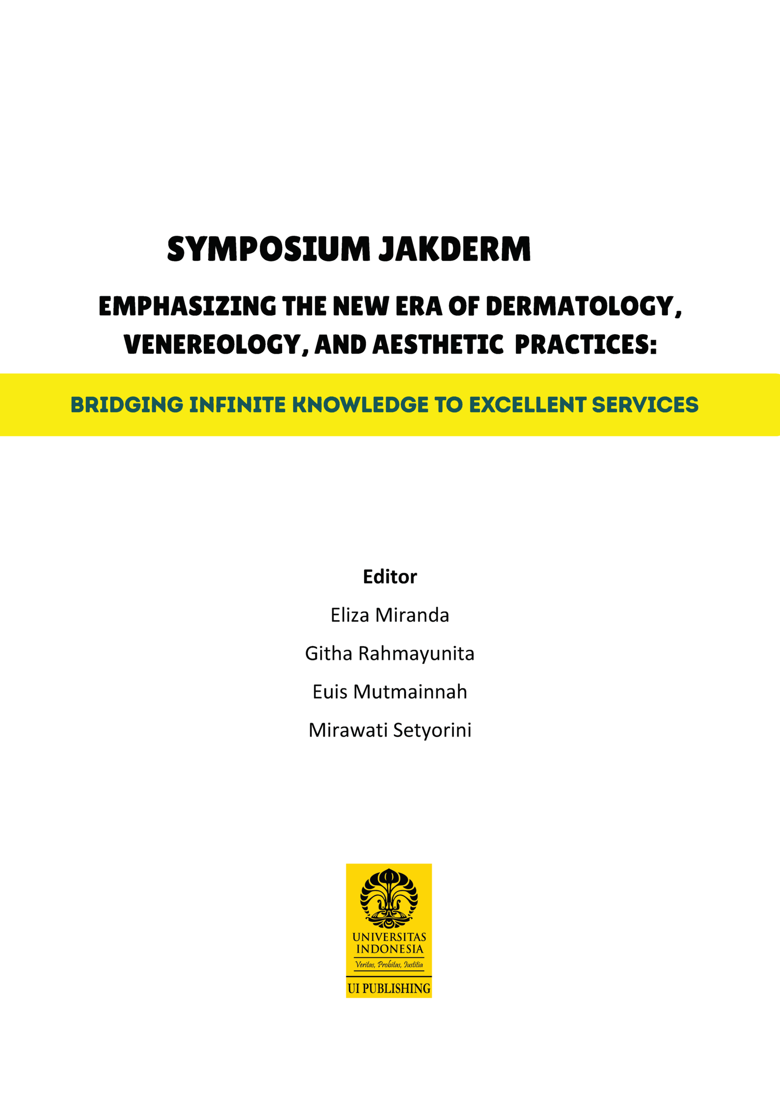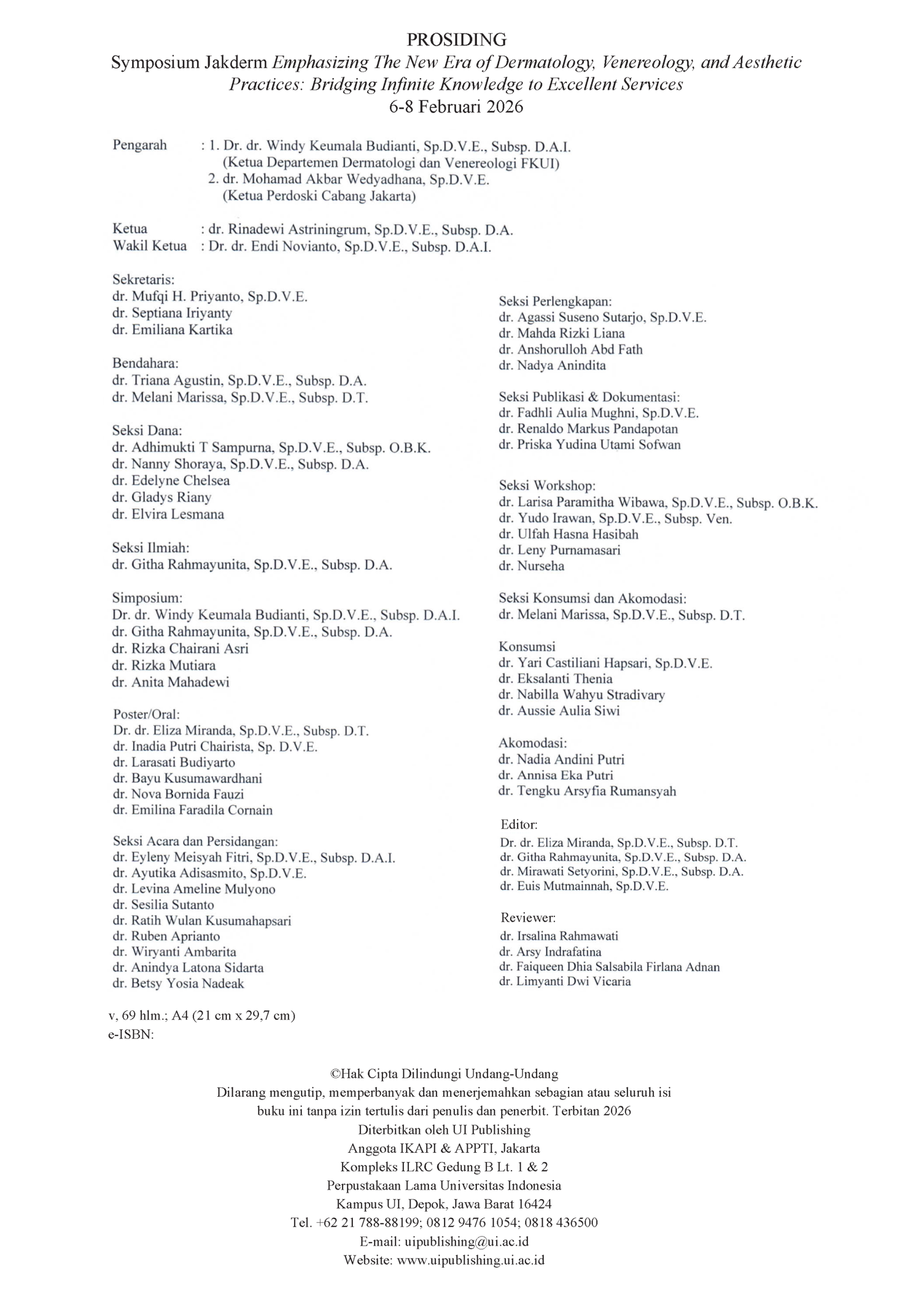 Prosiding Symposium Jakderm mengangkat tema “Emphasizing The New Era of Dermatology, Venereology, and Aesthetic Practices: Bridging Infinite Knowledge to Excellent Services”, sebagai refleksi atas transformasi besar dalam bidang dermatologi, venereologi, dan praktik estetika di era modern. Simposium ini menjadi wadah ilmiah yang mempertemukan para klinisi, akademisi, peneliti, serta praktisi estetika untuk berbagi pengetahuan terkini, inovasi teknologi, dan pendekatan berbasis bukti dalam meningkatkan kualitas pelayanan kepada pasien.